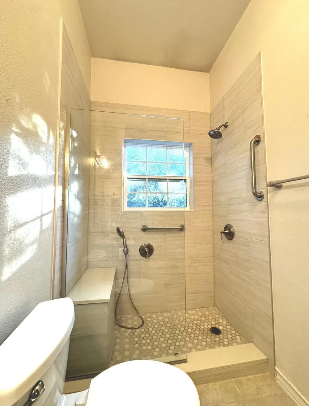 This remodel highlights the precision and functionality behind Rodio Luxury’s work. The walk-in shower features perfectly aligned wall tile, a custom bench, and a frameless glass partition for a clean, open layout. A window integration and upgraded plumbing fixtures were completed with exact measurements to ensure a watertight, durable finish. Every element was executed with care to maximize space, light, and long-term performance.