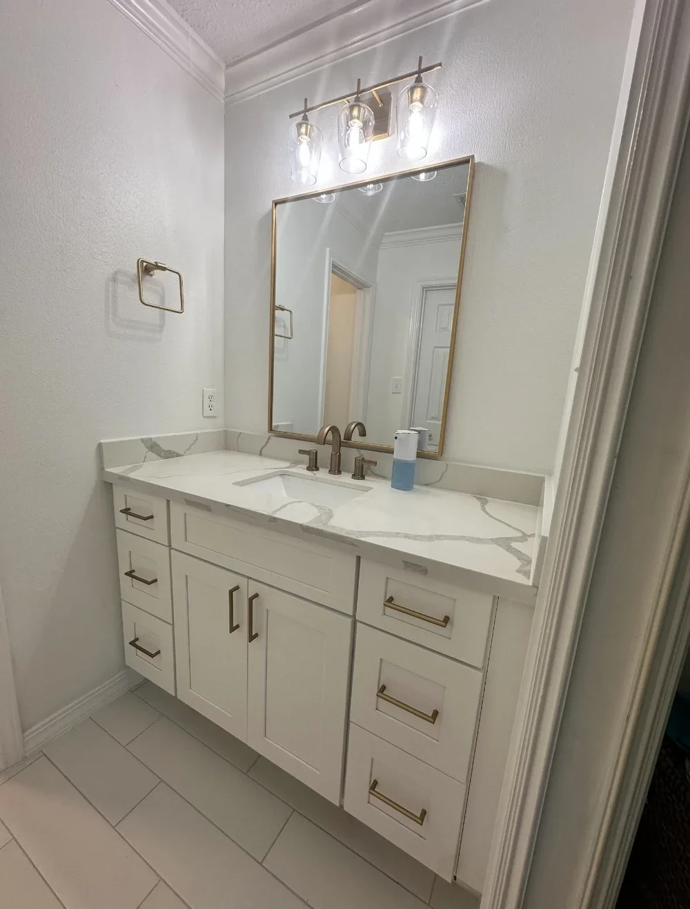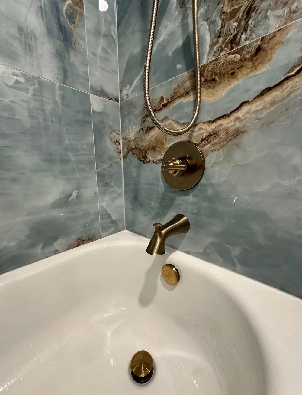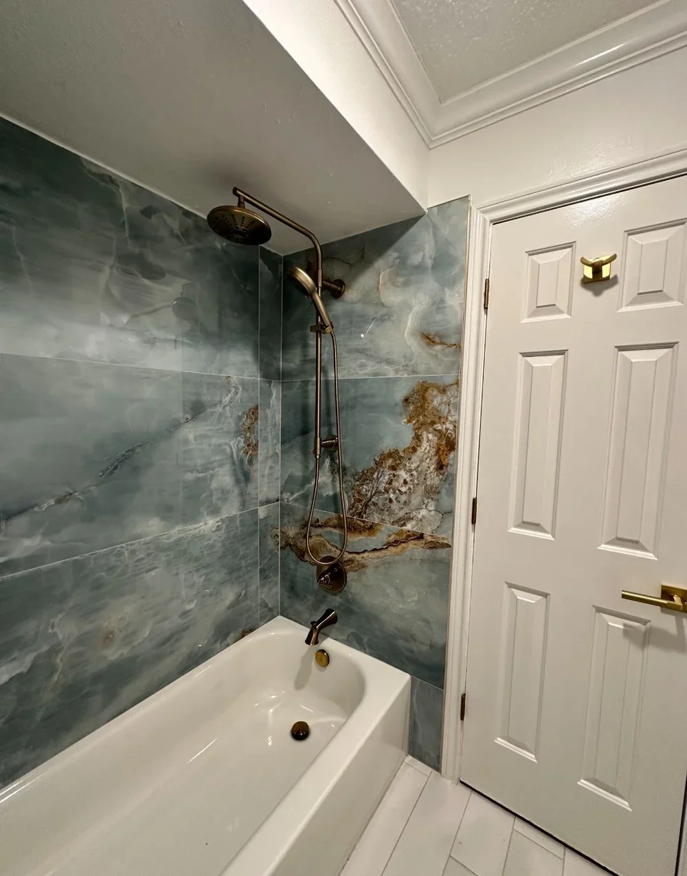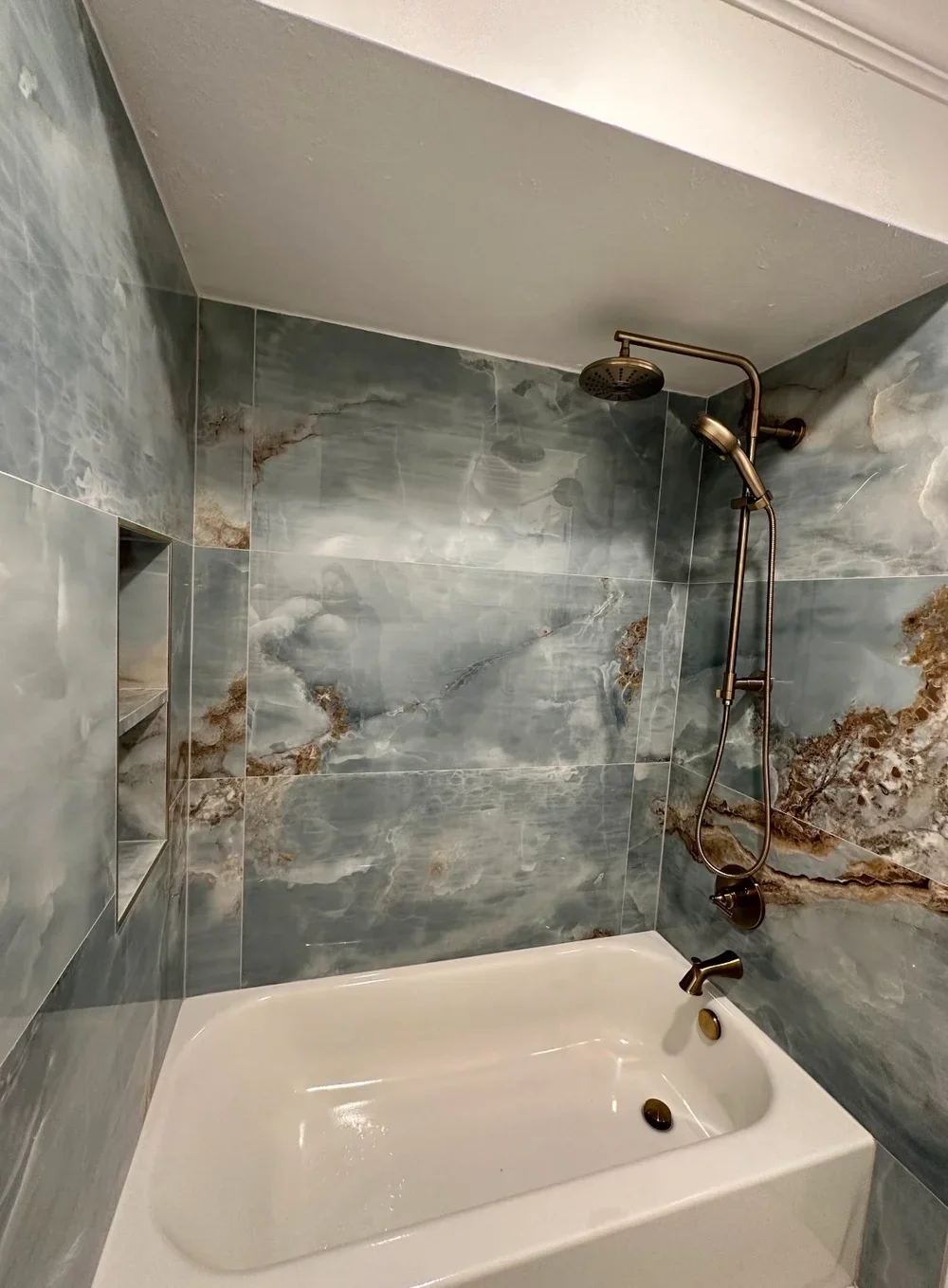 A refined Jack and Jill bathroom remodel featuring full-height large-format porcelain slabs, precisely aligned to create a seamless, continuous flow of veining. Every line and transition was installed with technical accuracy and minimal grout exposure, emphasizing a polished, spa-like aesthetic. This space exemplifies our commitment to precision craftsmanship and timeless quality.
