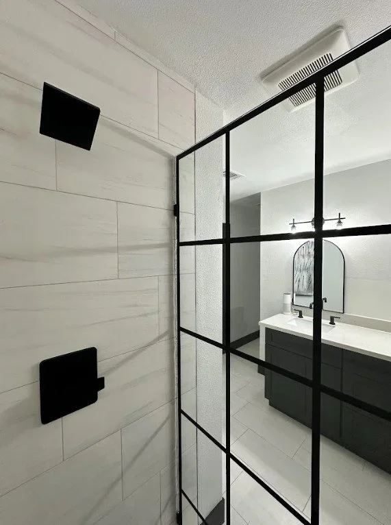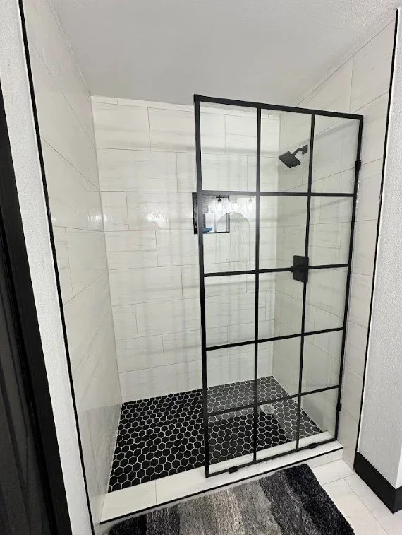 This contemporary bathroom remodel features a bold contrast of black and white tones brought to life through refined craftsmanship. Rodio Luxury installed custom matte-black fixtures and a grid-style glass shower enclosure for an architectural statement that elevates the space. The shower’s hex tile flooring adds depth and texture, balanced by sleek porcelain wall tile for a timeless finish. Every line, joint, and edge was executed with precision, showcasing Rodio Luxury’s commitment to elevated construction and modern design integrity.